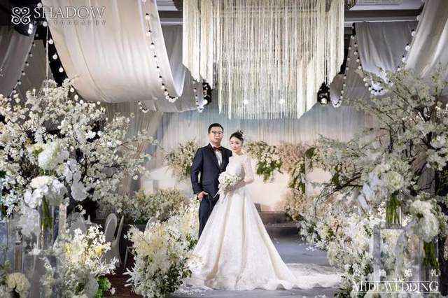 让婚礼回归纯粹和自然,白色的纱幔,水晶的装饰,白绿的花艺让现场高级满满。