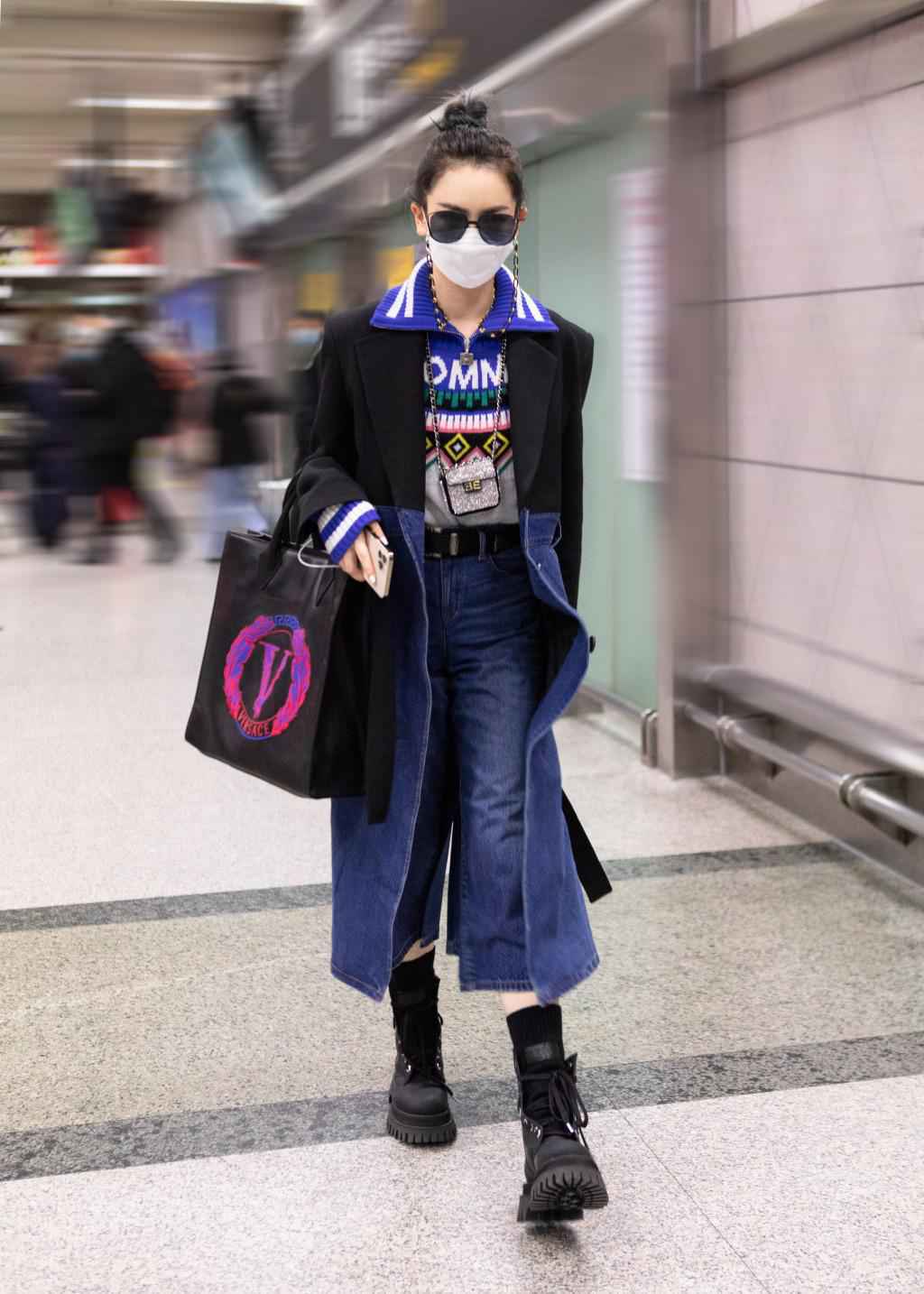 戚薇牛仔皮草配链条墨镜,混搭粉红玩偶包,帅气和可爱两者兼备美搭