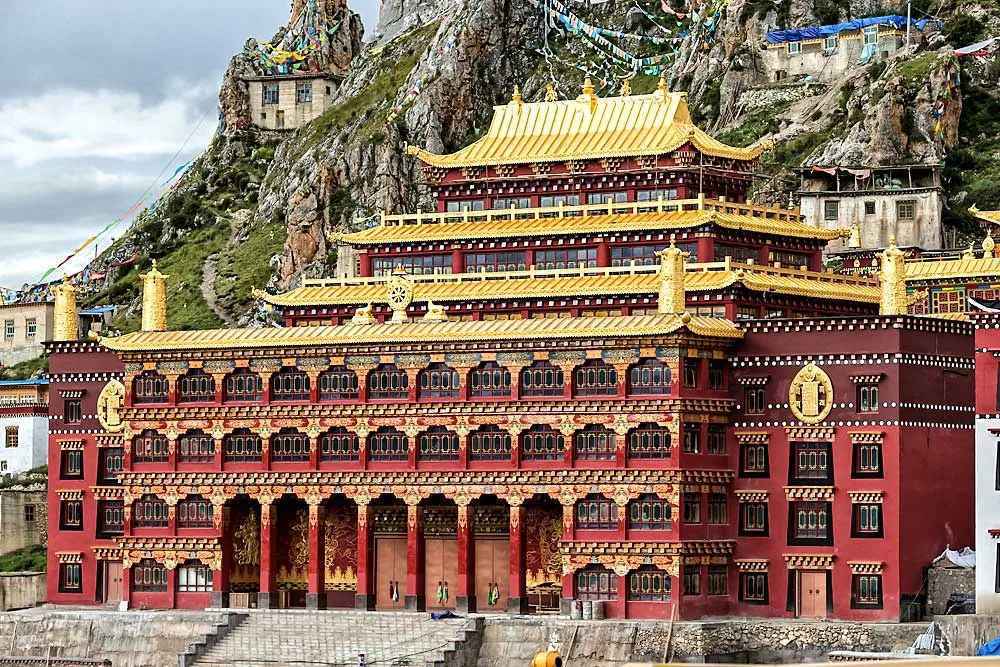 寺庙各类建筑依山而建,高低错落,雄伟庄严。有的宛如一座座神圣古堡,矗立在陡峭的岩峰之巅。