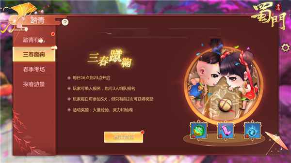天涯咫尺春满樱华,踏青寻春遍览风光。清明时节将至,《蜀门手游》踏青活动开启,遍插柳枝,遥放纸鸢,三春蹴鞠,更有惊喜踏青好礼相赠;一年之计在于春,春闱考场开放,邀好友快乐答题,丰厚奖励等你拿!