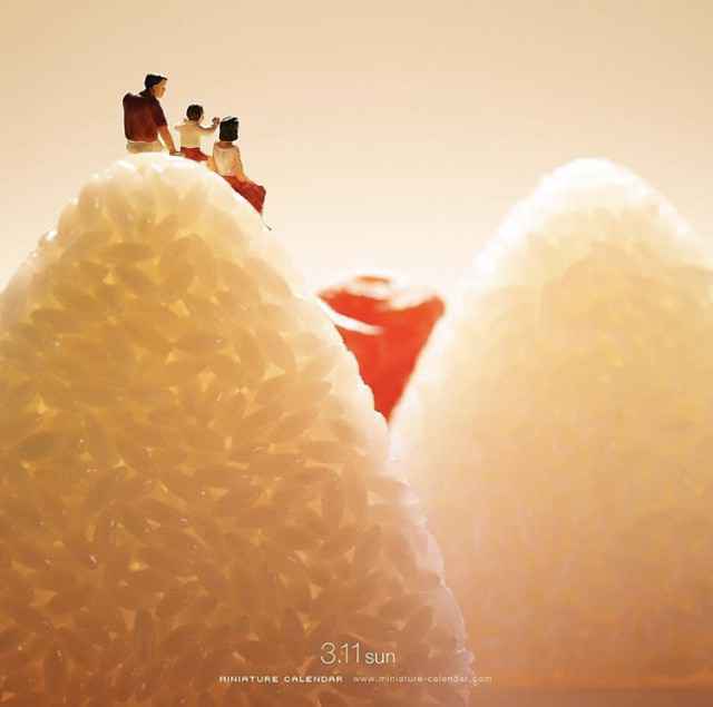 现实物品和美食被巧妙重组,这源于作者对于世界、生活敏锐的观察,以及良好的视觉转变能力。就像上图,调料盖和炸猪排的组合诞生了坦克;再看下图,米饭团的造型,配合三人坐下休息的状态以及景深虚实的拍摄,形成了坐在这山遥望那山的画面。我们感叹其惊艳的创意,被其独到的创意思路启发,也让我们对他未来的作品多了几分期待。