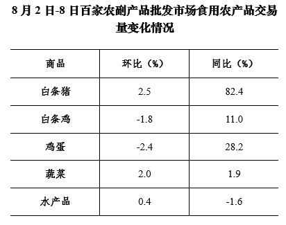 8月2日-8月8日全国36个大中城市食用农产品零售价格情况如下: 猪肉零售价格小幅反弹 。受生猪出栏头重下降,及部分地区...