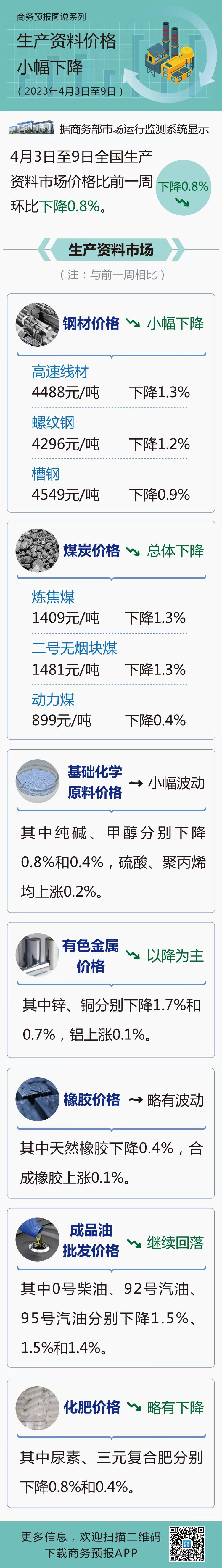 据商务部市场运行监测系统显示,4月3日至9日,全国生产资料市场价格比前一周下降0.8%。
