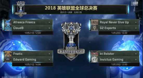 首先开始对决的是右半区的四支队伍,分别是RNG对阵G2,KT对阵IG。比赛的时间是北京时间10月20日的中午12:00以及下午16:00。