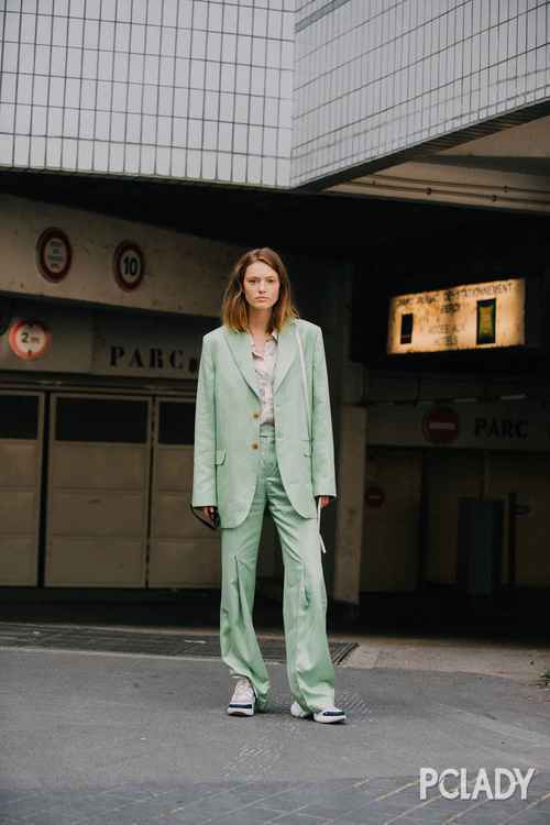 而典范的绿色西服套装则是潮人们的心头爱,搭配简约款的内搭才穿绿色清洁的气质,满身色彩不要凌驾三个哟,内搭也不要过于厚重,不占空间的内搭才让你看起来更修长嗷!