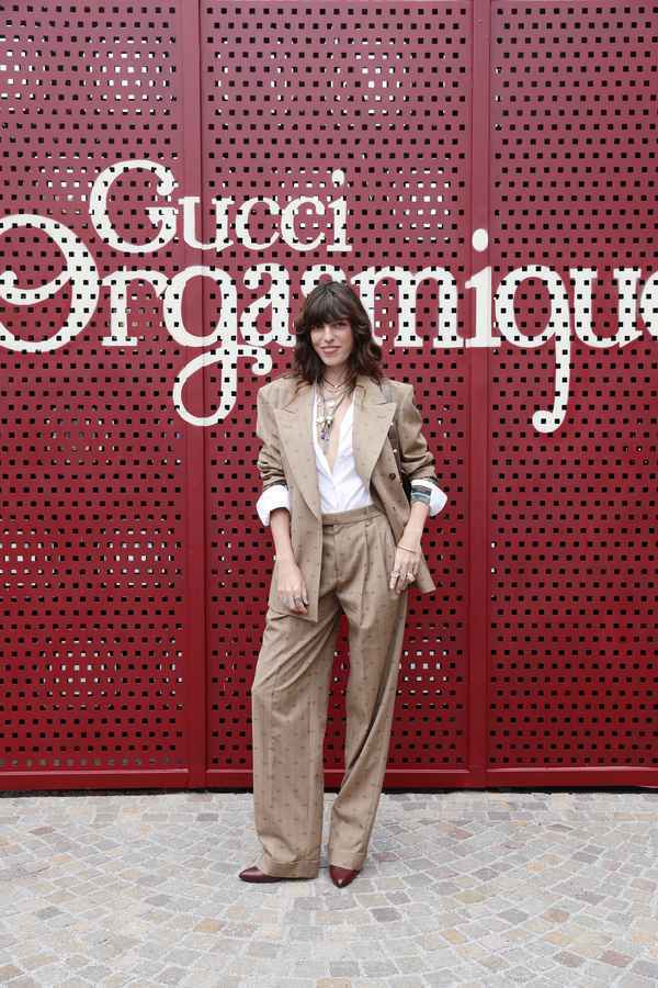 Lou Doillon衣着Gucci 2019秋冬系列Look 5米色复古GG细条纹双排扣茄克,白色衬衫,米色长裤,赤色皮革高跟鞋,金属耳朵图案胸针,Gucci 1955马衔扣肩背包。