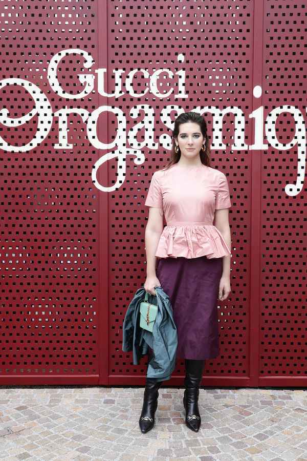 Alessandra Mastronardi衣着Gucci 2019秋冬Look 3饰刺绣与荷叶边细节真丝连衣裙,搭配Gucci 1955马衔扣系列肩背包。