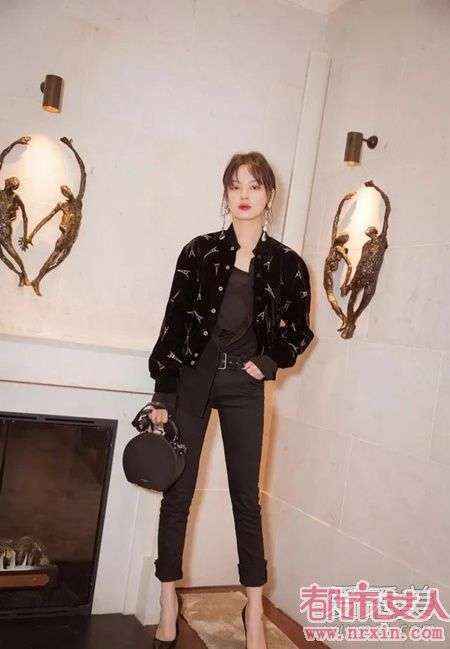 辛芷蕾活动造型,黑色小脚裤配高跟鞋干练时髦,将裤脚卷一卷,和露背高跟鞋搭配才更显腿长!上班搭配印花图案的短夹克,个性帅气。
