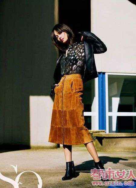 辛芷蕾写真造型,短款皮夹克配焦糖色百褶裙秋意十足,内搭透视波胆衬衫性感又俏皮,个性混搭才更显女人味有没有?