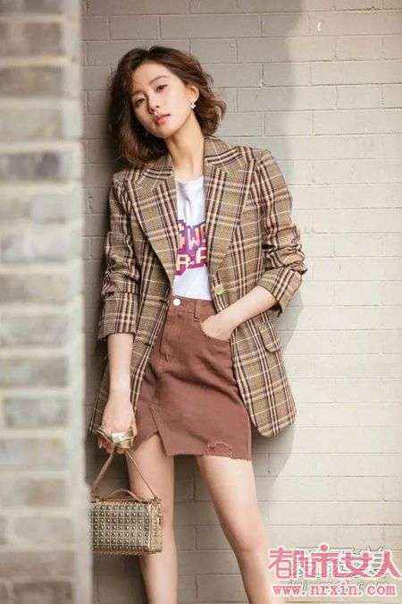 秋天西装外套是一定要火的,那西装外套配什么裙子好呢?首先一定是半裙,不过并不是那种迎宾小姐式的套装式穿法,像刘诗诗这样格纹西装外套+a字裙混搭才更吸睛,特别是格纹西装外套配牛仔短裙更是减龄。