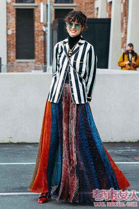 潮人街拍中,用竖条纹西装外套搭配这种彩虹色百褶裙也是很洋气的呢,百褶裙并不是只有基础款的,大胆撞色才更惊艳。秋冬周围日渐沉闷的时候更需要一点鲜活的颜色来增加亮点。