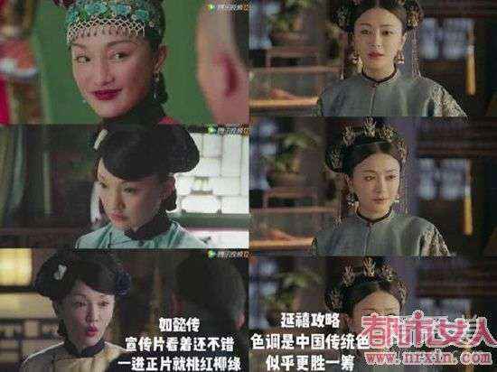 《如懿传》和《延禧攻略》对比,配色上也有很大的差别,看演员造型各种桃红柳绿,没有《延禧攻略》的色调看着高级。