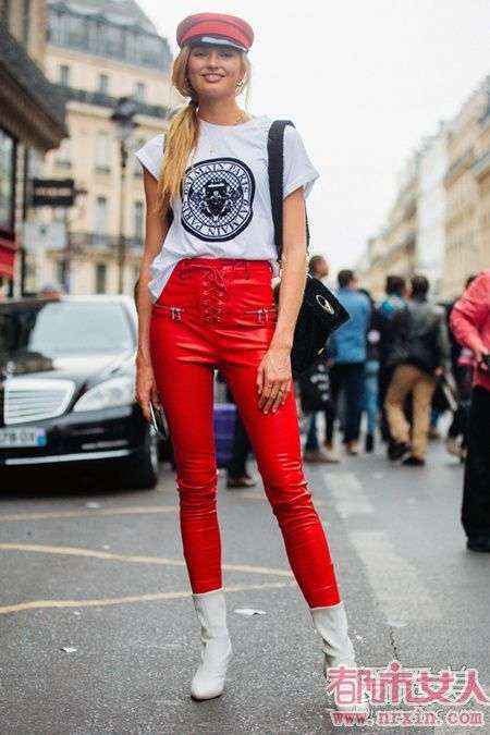 白色上衣和皮裤搭配,皮裤修饰身材增加帅气感,选择大红色更显活力,不想白色太过于苍白,搭配红色就好了!
