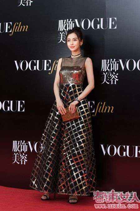 Angelababy红毯造型,那真的是盛装出席了,金线装饰的连衣裙很显华丽感,高腰大裙摆让他看起来很是高挑迷人,配丸子头也是蛮清爽的。