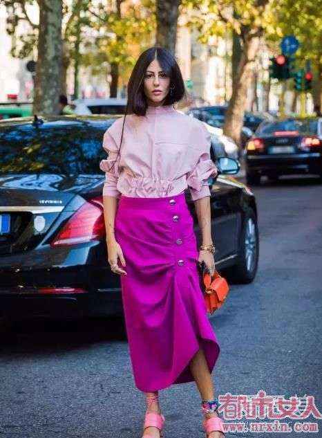 浅粉色衬衫+深紫色裙子,饱和度的紫色在欧美时尚圈可是很火呢,抢眼的紫色配上裙装浅粉色衬衫也能营造出小甜妹的感觉。