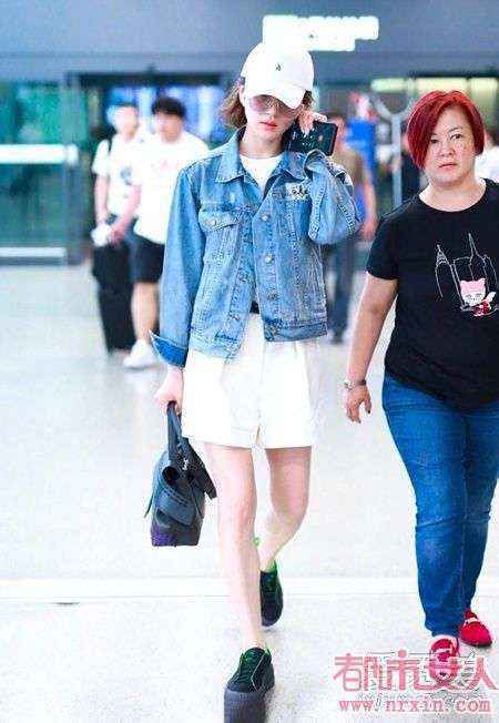 景甜机场街拍,牛仔短裤+短袜很少女心呢,这种口袋外露的牛仔裤在明星街拍中出镜率真的很好,毛边超短裤超级显腿长,就是感觉外套不是很好看。