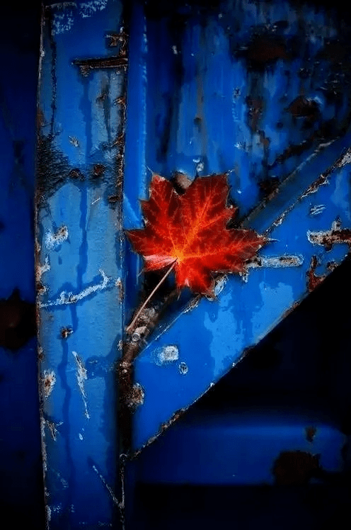 秋色落叶,大部分是红色,我们知道红色跟蓝色是对比色调,越是有冲突的色彩,照片看起来矛盾性就越强。所以在一个对比色的背景拍摄一片落叶,看起来就是惊艳。