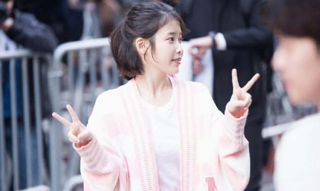 iu侧颜杀加上剪刀手,搭配这一身美美的衣服,漂亮!