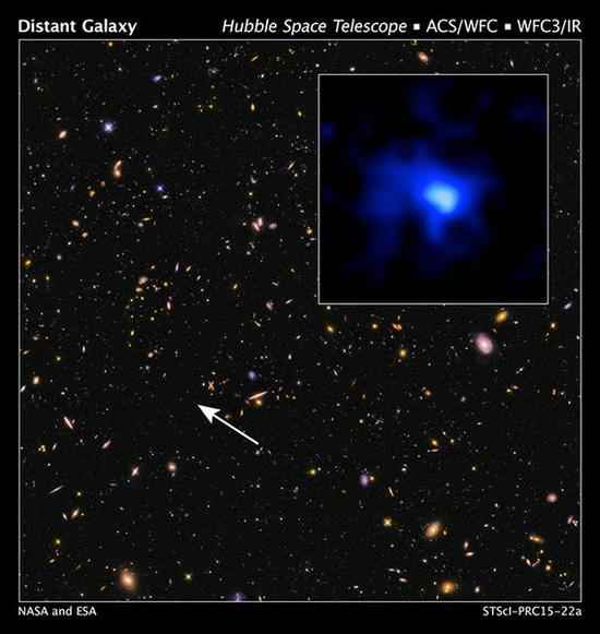 哈勃空间望远镜拍摄的这张照片中,箭头所指的那个不起眼的小光点(放大之后如插入图所示),就是此次发现的距离地球最遥远的星系,它发出的星光花了超过130亿年才来到地球。图片来源:NASA