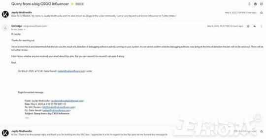 虽然2eggs想用沉默来让这件事自然消亡,但是越来越多的人开始在他的推特下面追问关于开挂的事。于是他开始使用谎言来应对,不仅编造了自己因为测试外挂软件而被误封的借口,还P了一份V社的回复邮件证明自己的清白!