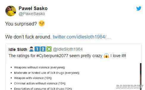 《赛博朋克2077》的任务设计总监Pawe? Sasko在推特上转发这则游戏在巴西评级的新闻,并且表示“你们感到很惊讶么?我们可不是乱搞的。”