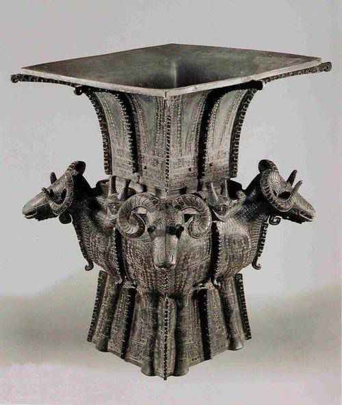 四羊青铜方尊,商朝晚期青铜礼器,祭祀用品。1938年出土于湖南宁乡县黄材镇月山铺转耳仑的山腰上。收藏于中国国家博物馆。国家第三批禁止出境展览文物。