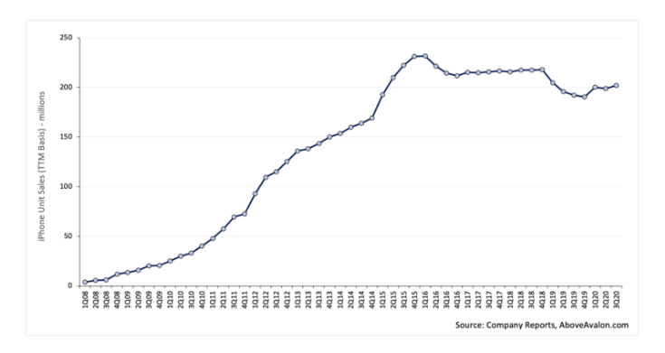 从赛巴特提供的数据来看,近两年iPhone的销售情况的确经历过一些起伏。在2019年年初,因中美贸易之间紧张的局势,iPhone的销售出现一些实质性的疲软。而在过去12个月里,iPhone的销售量自2019年年初下降了12%,从每年新增2.18亿下降至1.91亿。但在新冠疫情之前,iPhone业务还是有逐步改善的迹象,特别是从2019年下半年到2020年年初。