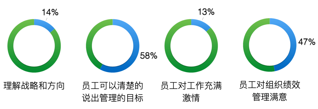 据调查显示,14% 的员工能够理解公司战略和方向;58% 的员工可以清楚地说出管理的目标;13% 的员工对工作充满激情,会有创新行为;47% 的员工对组织绩效管理表示满意。