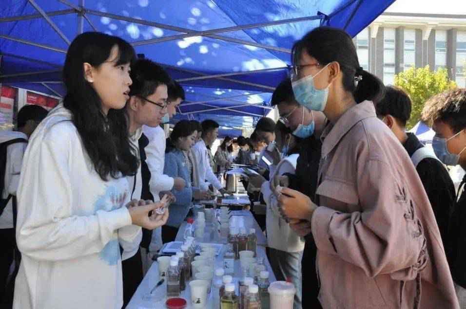 那是“Woo!Mind!我卖”创意集市,有中药润唇膏、北中医定制款帆布包和卫衣、特色中药花茶......你看,那边还可以亲手做香囊,一起去看看吧~