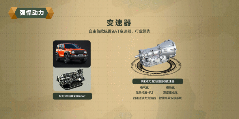 而坦克平台的三大核心优势,可以说和咱们普通消费者更息息相关。首先是动力优势——动力更强,效率更高。在常规燃油发动机上,坦克平台可实现等于或大于38%的发动机热效率,以行业来看,这个数据非常可观。同时,将诞生中国首款纵置9AT变速器,扭矩密度和齿比跨度同级领先,重量更轻、动力性能更好、传动效率更高。比如,坦克平台已经公开的3.0GDIT+ 9AT P2(插混)的动力组合,可以说堪称全球最强越野动力,其系统总功率为380kW,峰值扭矩可达750N·m。相信爱玩越野的人应该清楚,这个数据绝对能让一辆车成为“越野利器”。