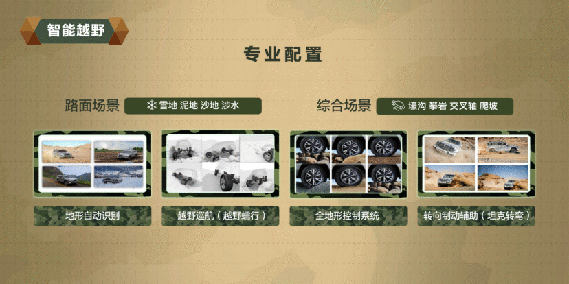 其次是配置优势——越野配置更加丰富和专业。在坦克平台上,不仅搭载了硬派智能四驱系统、超大行程的主动悬架系统、电控减震器、主动稳定杆以及三把差速锁等,更能实现前后轴实时最大驱动力分配范围可达0~100%:100%~0。也就说,即便在狭小的越野空间中转向,也能从容应对各种复杂路况。而具体来讲,这些专业的越野配置还包括全场景切换(雪地、泥地、沙地、涉水、壕沟、攀岩、交叉轴等),并且能够自动识别地形,进行越野巡航(低速蠕行),转向制动辅助(“坦克掉头”)等功能,让驾驶者在越野时不仅能够更加轻松的驾驭,更能够有安全保障。