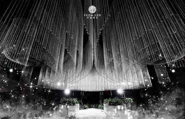 以水晶为主要元素,穹顶之下,上万颗晶莹剔透的水晶珠帘倾泻而出,