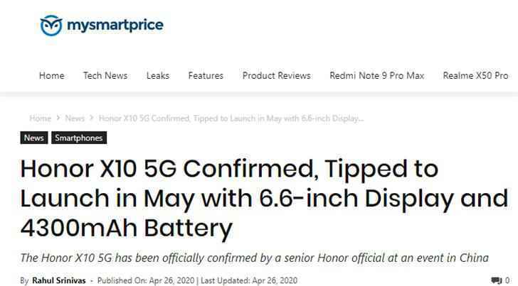 IT之家了解到,外媒mysmartprice现已曝光了荣耀X10 5G的部分配置信息。荣耀X10 5G将采用6.6英寸屏幕,内置4300mAh电池,预计将于5月发布。