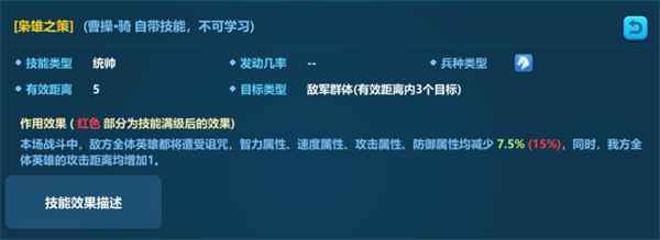 以曹操的技能【枭雄之策】为例,为什么这个技能如此强大呢?因为统帅技能生效在科技加成、称号加成、兵种加成之后,所以他的属性削减是这些加成之后的属性,越到后期,削减的效果也显著。