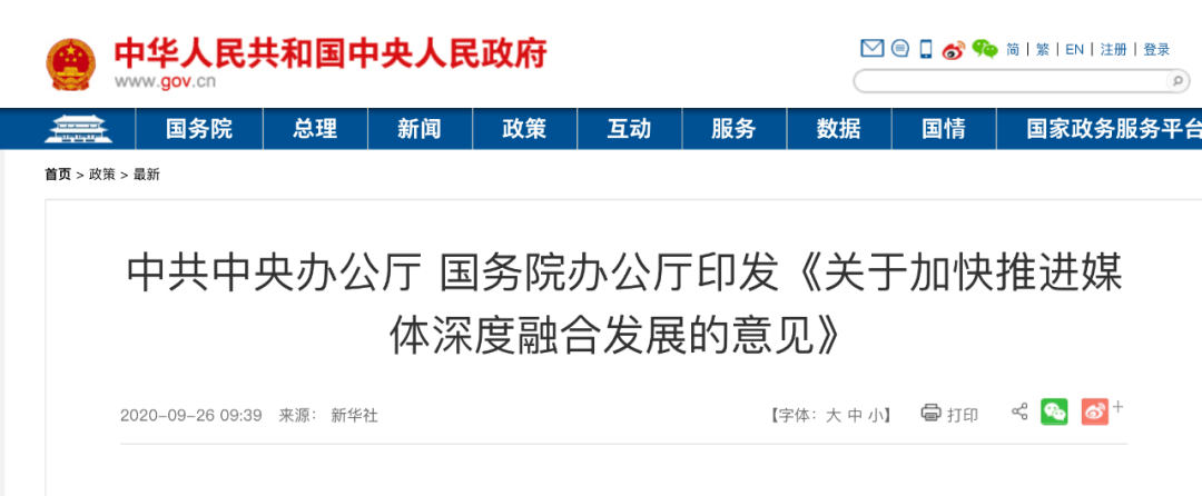 今年9月,中央印发 《关于加快推进媒体深度融合发展的意见》,提出“推动传统媒体和新兴媒体在体制机制、政策措施、流程管理、人才技术等方面加快融合步伐,尽快建成一批具有强大影响力和竞争力的新型主流媒体,逐步构建网上网下一体、内宣外宣联动的主流舆论格局,建立以内容建设为根本、先进技术为支撑、创新管理为保障的全媒体传播体系”。